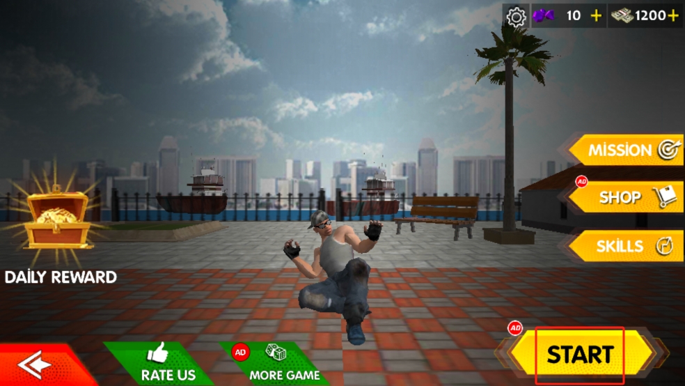 2、領(lǐng)取完獎(jiǎng)勵(lì)之后來一個(gè)在高樓江邊城市背景之下,眼前的這個(gè)肌肉男黑人就是你所操控的角色,與他點(diǎn)擊【START】前往無盡的探索之間;