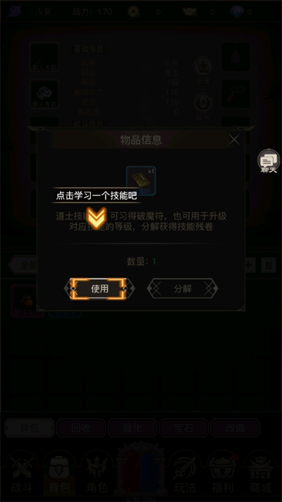 4、背包中如果有可以學(xué)習(xí)的技能,點(diǎn)擊技能書本就可以看到技能介紹然后點(diǎn)擊使用即可學(xué)習(xí)技能。