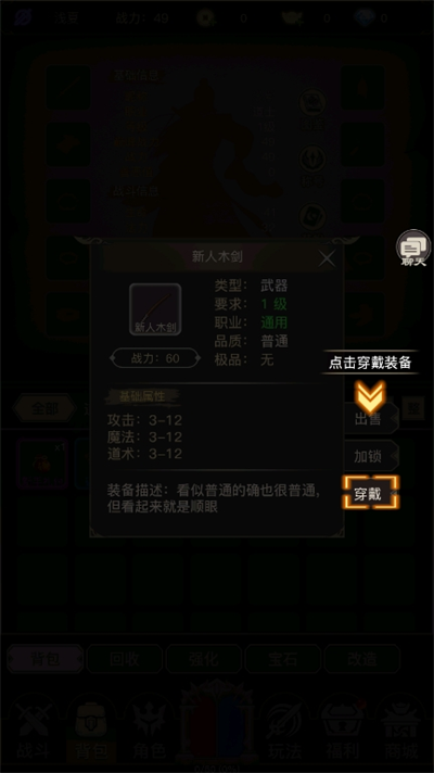 3、點(diǎn)擊穿戴就可以成功的裝備好武器,并且還可以通過點(diǎn)擊把不要的裝備出售掉;