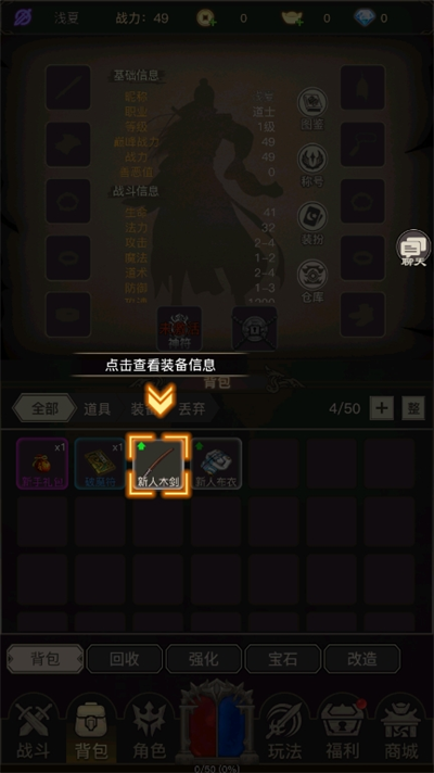 2、比如在這里可以查看到當(dāng)前可以裝備的物品,首先先把武器裝備好后續(xù)還可以獲得更多武器;