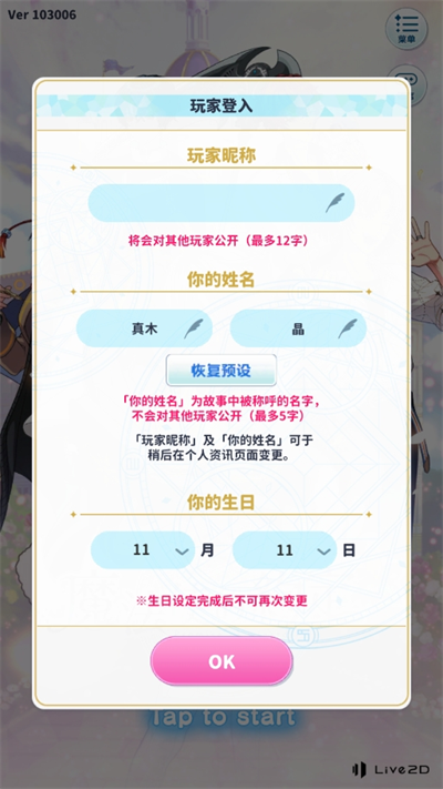 3、接著進入玩家的賬號登錄,輸入好自己的昵稱和姓名。生日后就可以進入角色性別選擇;