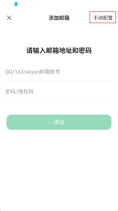 3、點擊后進(jìn)入添加郵箱功能界面,然后找到右上角【手動配置】選項進(jìn)行點擊;