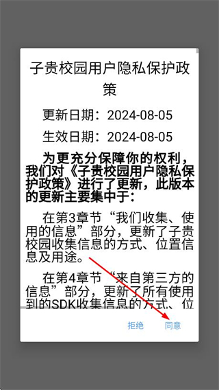 1、打開(kāi)子貴校園,在彈出的提示框中,點(diǎn)擊同意。