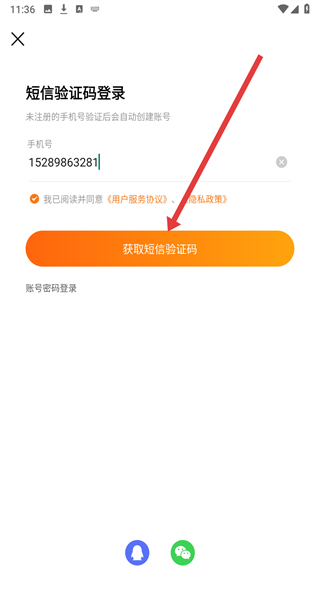 3、輸入手機(jī)號碼,勾選協(xié)議后點擊“獲取短信驗證碼”進(jìn)行注冊登錄操作。