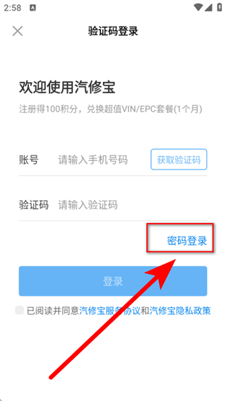 2、在驗證碼登錄界面,點擊密碼登錄,進入密碼登錄的頁面。