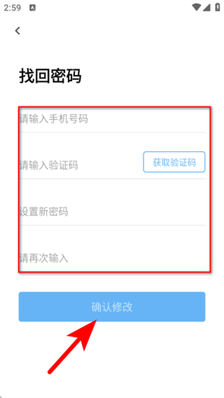 4、在頁面依次輸入手機號等信息后,點擊確認修改,即可完成密碼找回操作。