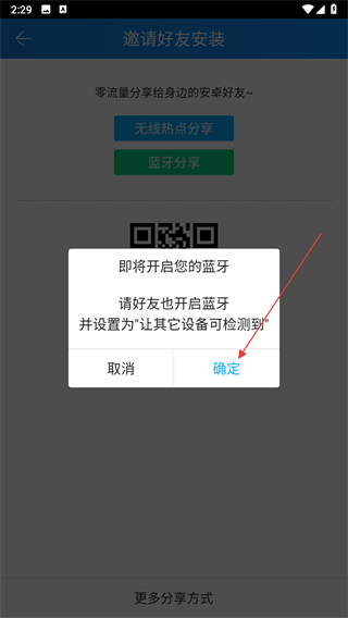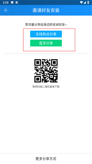2、在邀請好友安裝頁面,可選擇無線熱點分享或藍牙分享兩種方式。
