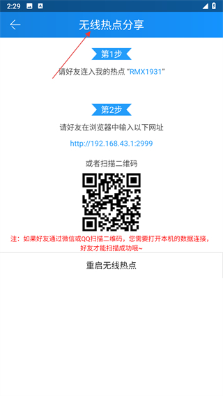 3、選擇無線熱點分享后,按照提示讓好友連接熱點并通過網(wǎng)址或二維碼下載安裝。