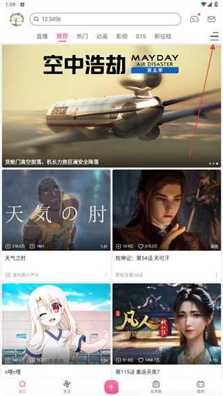 1、啟動嗶哩嗶哩APP,進(jìn)入首頁點(diǎn)擊右上角三個橫線的圖標(biāo)。