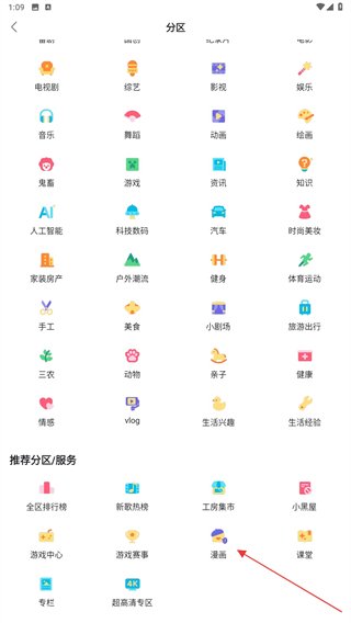 2、進(jìn)入分區(qū)的界面內(nèi),在推薦分區(qū)/服務(wù)下找到并點(diǎn)擊漫畫。
