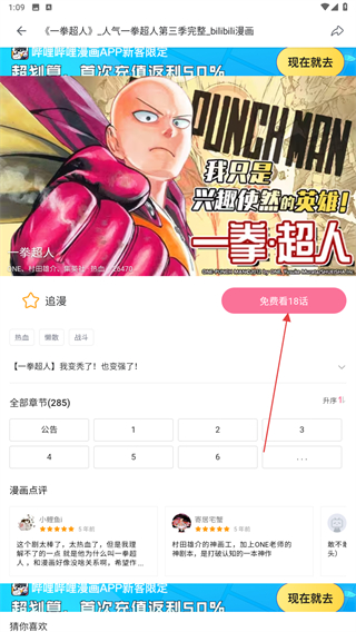 4、進(jìn)入該漫畫的詳情頁面內(nèi),點(diǎn)擊免費(fèi)看18話即可開始看。
