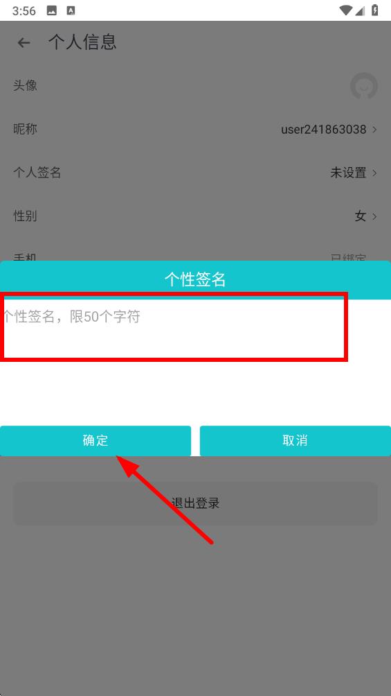 4、在個性簽名編輯頁面的輸入框內(nèi),輸入你想要設(shè)置的個性簽名,輸入完成后點擊確定按鈕即可成功修改個性簽名。