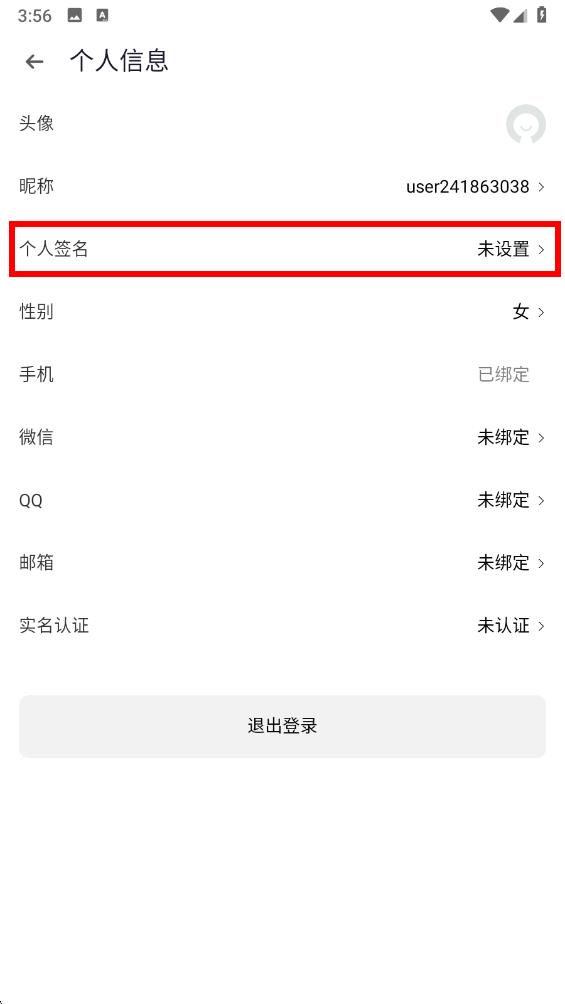 3、進(jìn)入個人信息界面后找到個人簽名選項,點擊該選項就會進(jìn)入個性簽名編輯頁面。