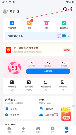 3、進(jìn)入個(gè)人主頁內(nèi),點(diǎn)擊手機(jī)降溫的功能按鈕。