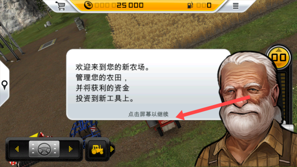 1、進入模擬農(nóng)場14的游戲標題界面,然后點擊【TOUCHTOBEGIN】手指所指的按鍵,開始游戲。