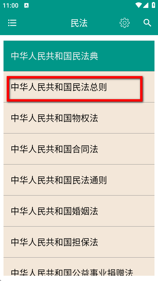 3、在民法分類頁面,點(diǎn)擊中華人民共和國民法總則等具體法律條目。