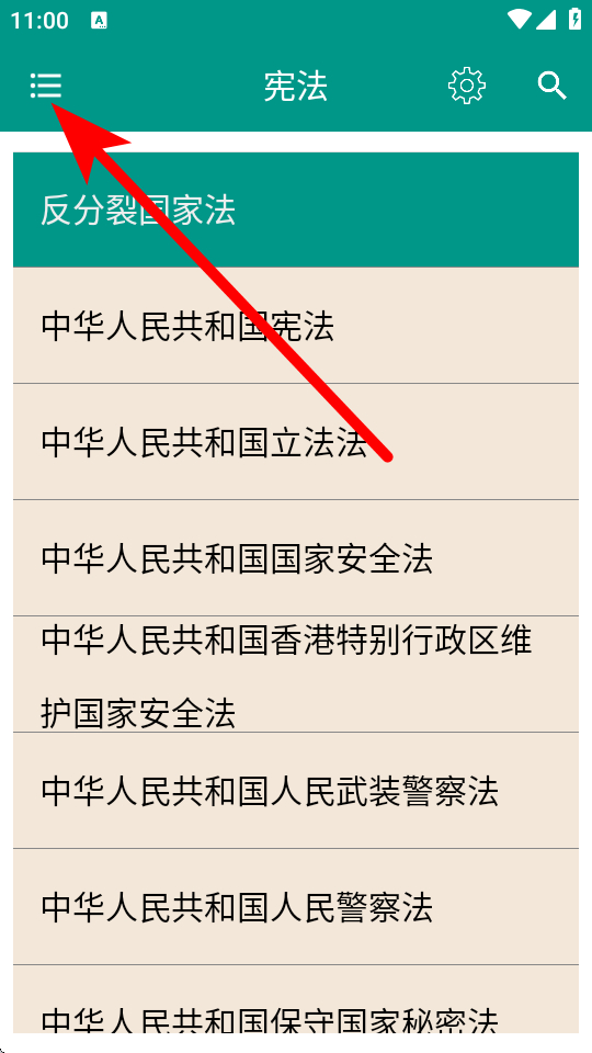 1、在法律法規(guī)APP主頁面,點(diǎn)擊左上角菜單圖標(biāo),展開法律分類列表。