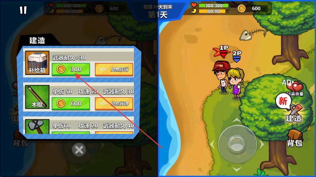 1、進(jìn)入游戲,你與好友置身荒島,先從拾取周邊零散木棍、石塊開始,著手收集基礎(chǔ)資源,為生存做準(zhǔn)備。