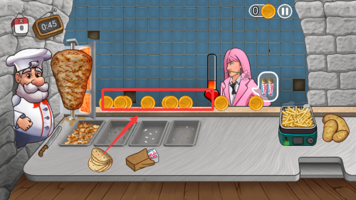 1、基礎(chǔ)操作簡單直觀,拖拽食材完成組裝,滑動(dòng)屏幕進(jìn)行切割。訂單處理講究效率,需要合理規(guī)劃制作順序。多單同時(shí)處理時(shí),可以暫存半成品提高效率。