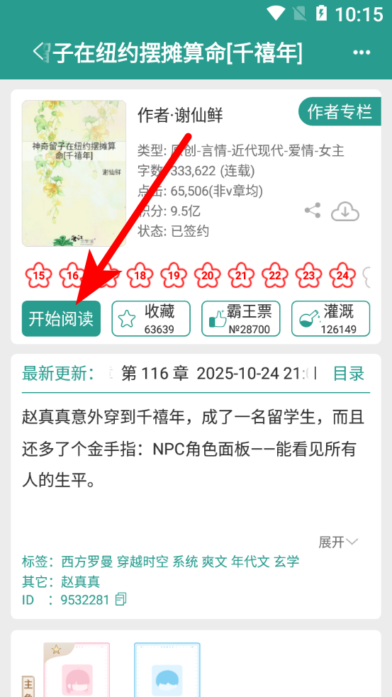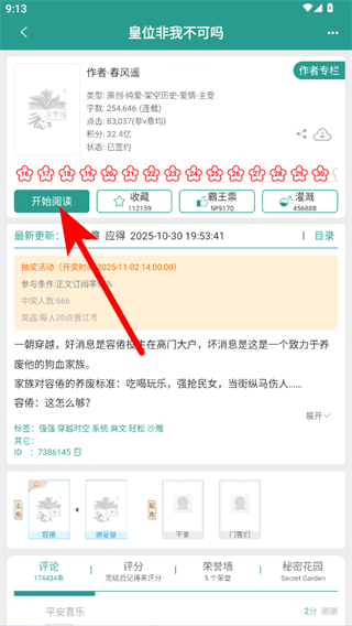 2、在小說(shuō)詳情界面,點(diǎn)擊開(kāi)始閱讀按鈕,進(jìn)入小說(shuō)閱讀頁(yè)面。