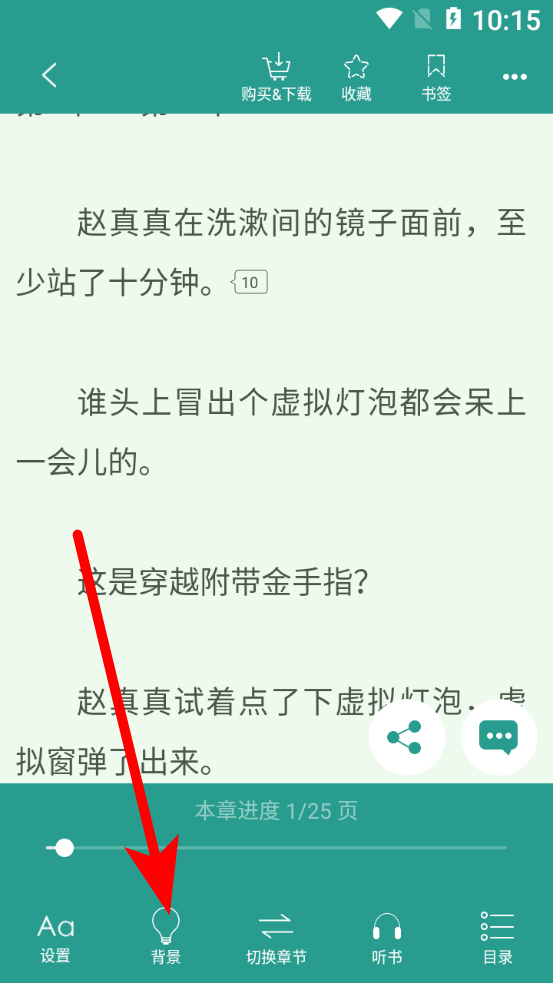 3、在小說(shuō)閱讀頁(yè)面,點(diǎn)擊下方背景選項(xiàng),進(jìn)入背景設(shè)置界面。