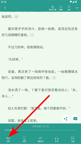 3、在小說(shuō)閱讀頁(yè)面,點(diǎn)擊左下角設(shè)置選項(xiàng),展開(kāi)設(shè)置菜單。