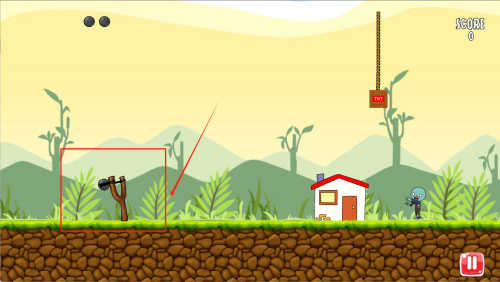 2、操作彈弓瞄準右側(cè)懸掛的紅色方塊,拖動屏幕調(diào)整射擊角度,利用拋物線原理避開房屋障礙,精準命中目標獲取分數(shù)。