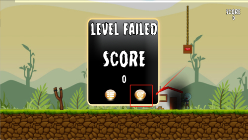 3、關(guān)卡失敗后查看"SCORE 0"得分提示,點擊紅框標注的右側(cè)TNT圖標使用炸彈道具,可清除障礙物重新挑戰(zhàn)當前關(guān)卡。