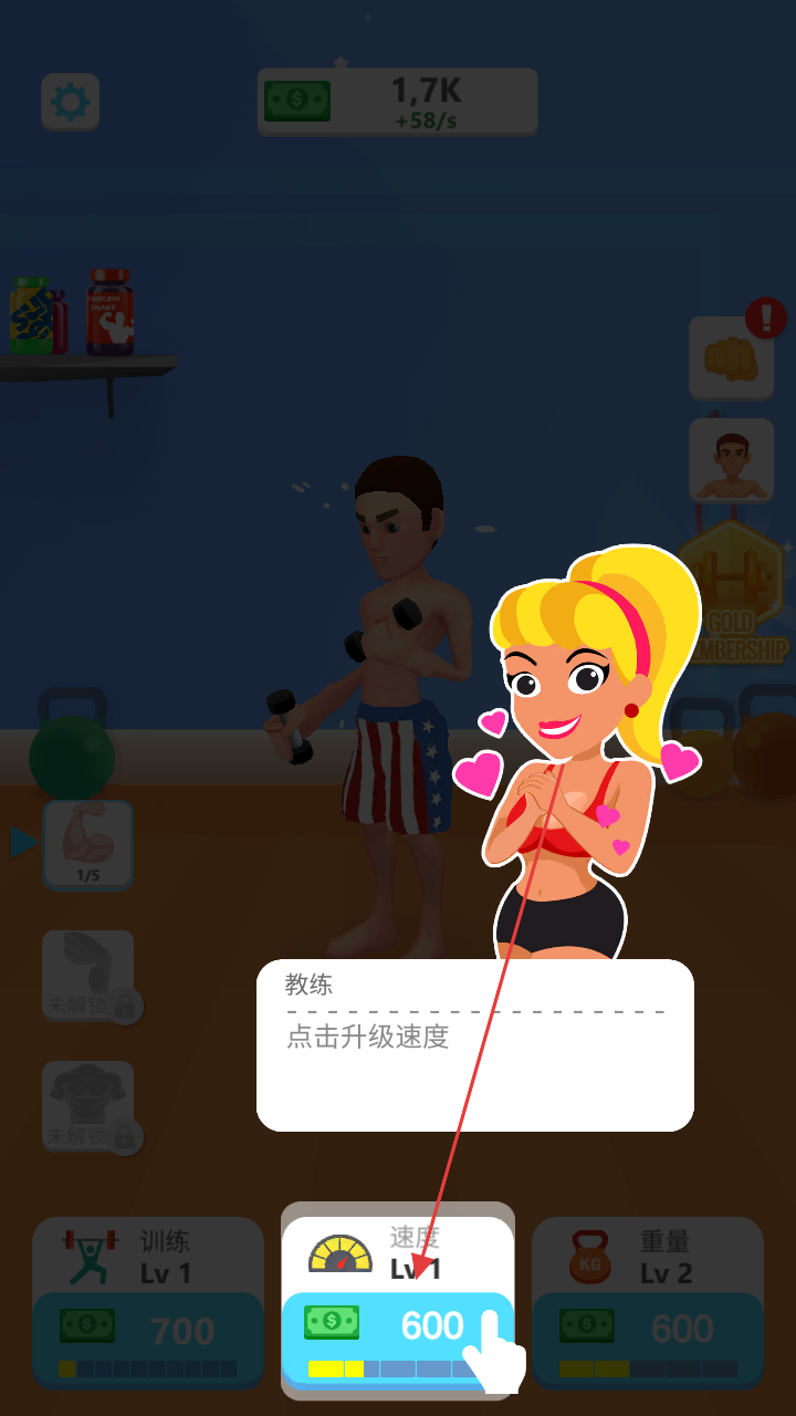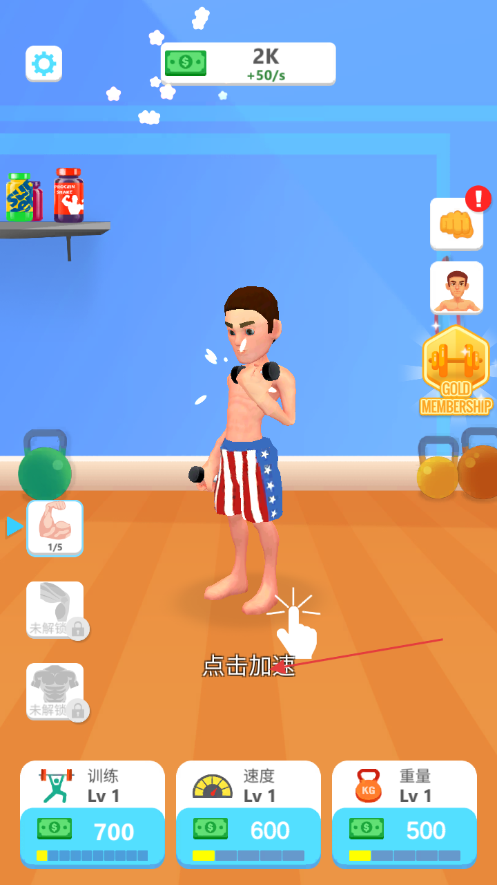 1、進(jìn)入游戲界面,點(diǎn)擊“點(diǎn)擊加速”按鈕,加快健身訓(xùn)練進(jìn)程,提升角色屬性。