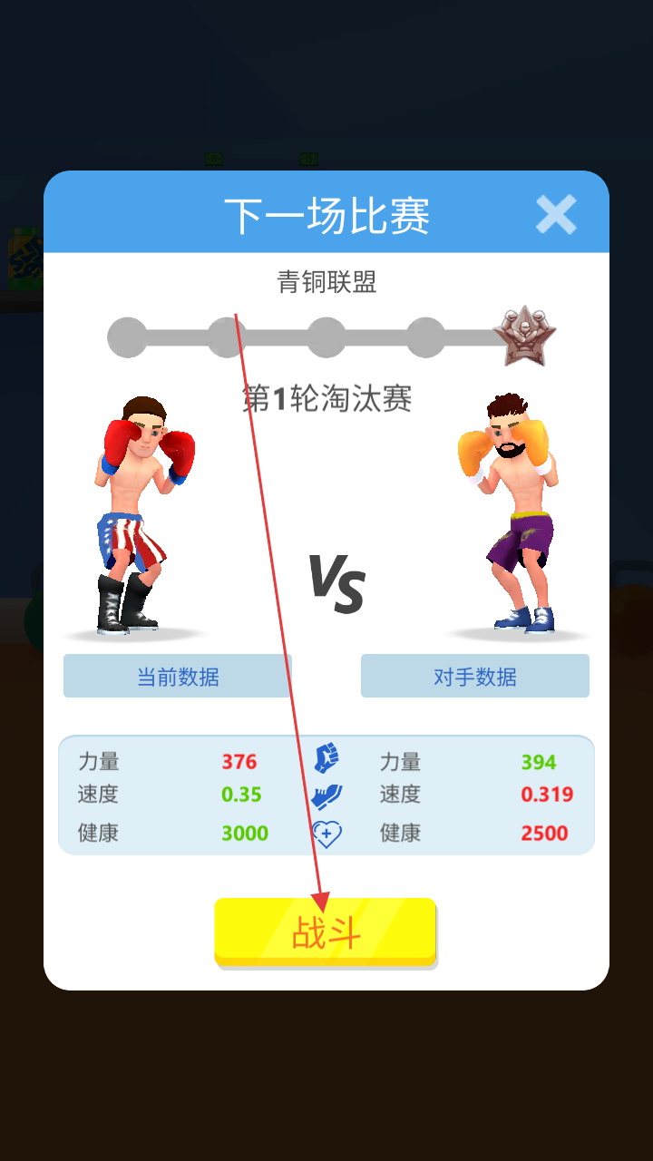 3、在比賽界面,查看雙方數(shù)據(jù),點(diǎn)擊“戰(zhàn)斗”按鈕,讓訓(xùn)練后的角色參與拳擊對(duì)決。