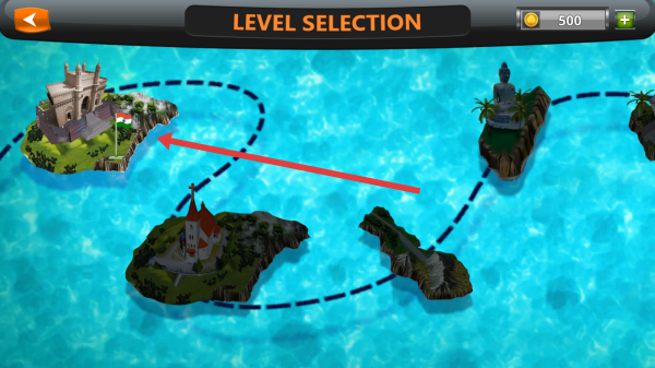 2、在“LEVEL-SELECTION”頁,選箭頭指向的島嶼關(guān)卡,點(diǎn)擊它進(jìn)入后,規(guī)劃航線,準(zhǔn)備航行挑戰(zhàn)。