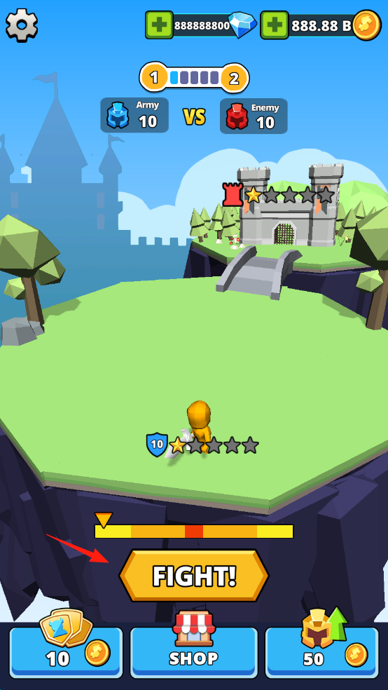 1、點(diǎn)擊【FIGHT!】(紅箭頭),匹配敵軍(10VS10),進(jìn)入戰(zhàn)場(chǎng),指揮初始士兵(黃色)推進(jìn)。