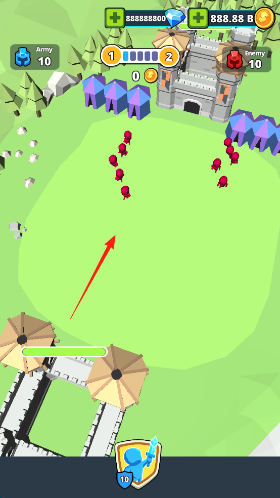 2、在戰(zhàn)場(chǎng)(紅箭頭),讓士兵沿路徑移動(dòng),接近敵方(紅色)陣地,利用數(shù)量?jī)?yōu)勢(shì),消耗敵方兵力。