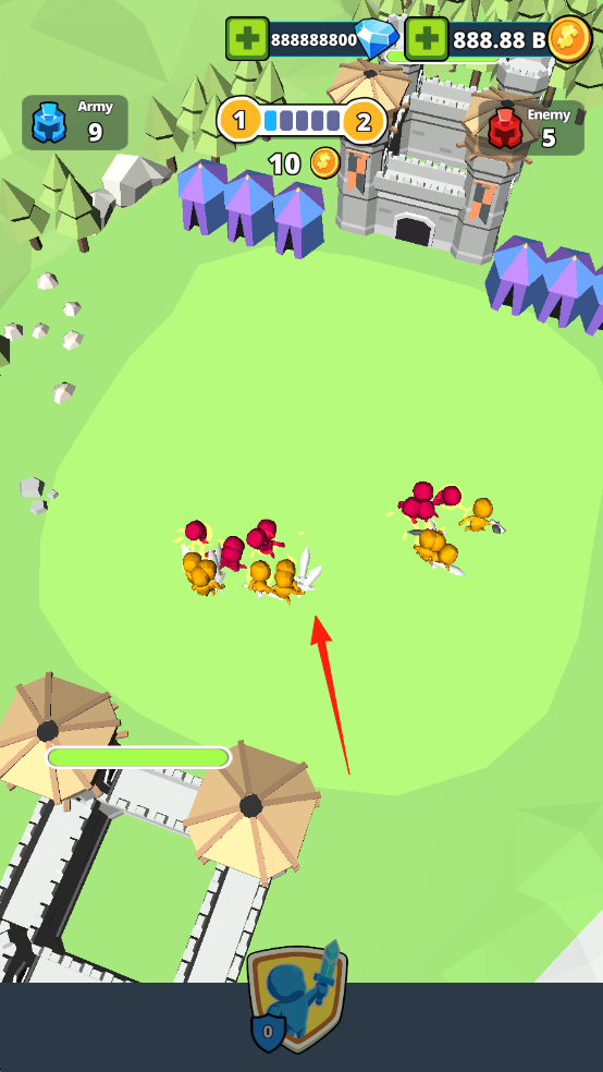 3、戰(zhàn)斗中(紅箭頭),自動(dòng)觸發(fā)士兵合成(黃+黃→更強(qiáng)單位),提升戰(zhàn)力,攻克敵方城堡,獲取勝利。
