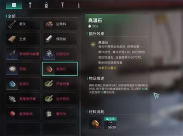 1、制作高溫石需先燒制20個炭,解鎖模因后合成恒溫石,再與炭結(jié)合獲得,單次使用提升10點抗寒值,持續(xù)30分鐘。