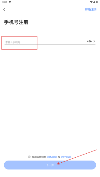 2、進入手機號注冊的頁面內(nèi),輸入手機號再點擊下一步。