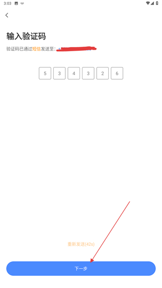 3、將收到的驗證碼輸入其中后,再點擊下一步的按鈕。