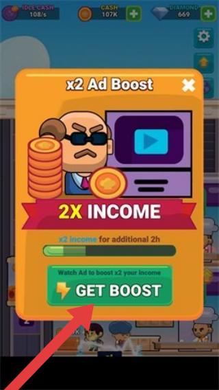 1、顯示“x2AdBoost”功能,可通過觀看廣告獲得2小時2倍收入(2XINCOME),是提升收益、推進(jìn)經(jīng)營的常見廣告激勵機(jī)制。