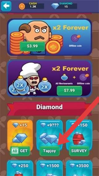 2、有“x2Forever”永久雙倍收益的付費項目,下方“Diamond”板塊可通過“AD”“Tapjoy”“SURVEY”等方式獲取鉆石,用于經(jīng)營提升等。