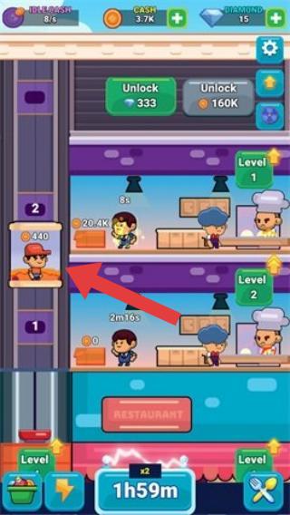 3、呈現(xiàn)餐廳多層員工布局,有“Unlock”按鈕及對應(yīng)鉆石、金幣消耗,不同層級員工有等級、進(jìn)度等信息,是餐廳經(jīng)營、員工管理與升級的環(huán)節(jié)展示。