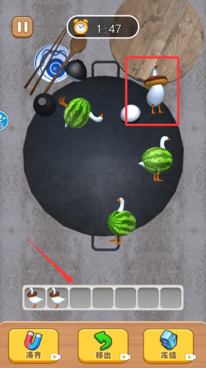 2、點(diǎn)擊凍結(jié)或移動(dòng)按鈕,處理鍋內(nèi)西瓜和鵝。