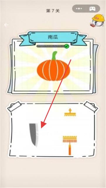 2、在“南瓜”關(guān)卡(第7關(guān)),選擇下方刀具,拖動(dòng)到南瓜處,完成對(duì)應(yīng)物品的互動(dòng)解謎。