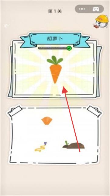 3、面對(duì)“胡蘿卜”關(guān)卡(第1關(guān)),將下方符合邏輯的道具(如土壤旁物件)拖動(dòng)到胡蘿卜,完成配對(duì)。