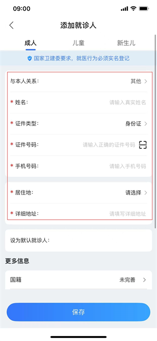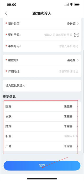 5、完善更多信息,填寫完成后點(diǎn)擊保存,即可完成就診人添加操作。