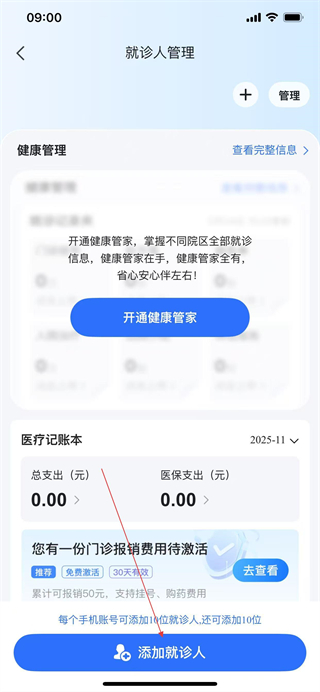 3、在就診人管理頁面點(diǎn)擊添加就診人按鈕。