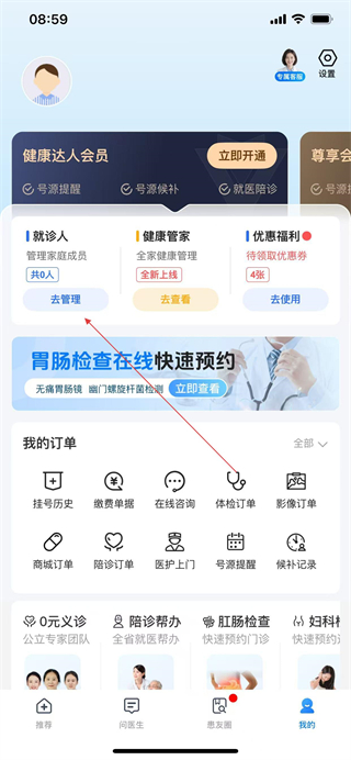 2、進(jìn)入個人頁面后點(diǎn)擊就診人板塊的去管理按鈕。