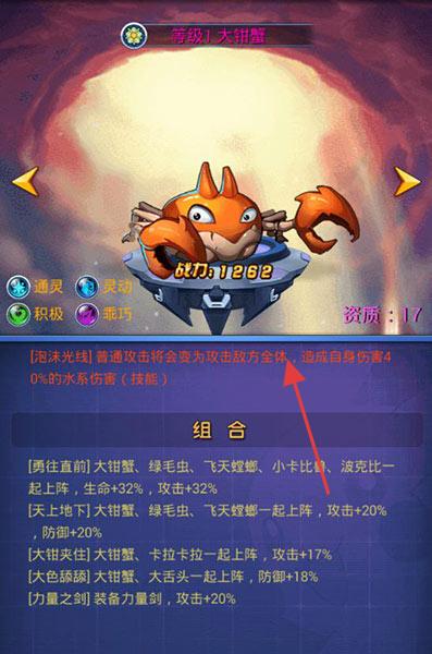 2、群攻:大鉗蟹,【泡沫光線】普通攻擊將會變?yōu)楣魯撤饺w,造成自身傷害40%的水系傷害,(+4則傷害提升為60%)。