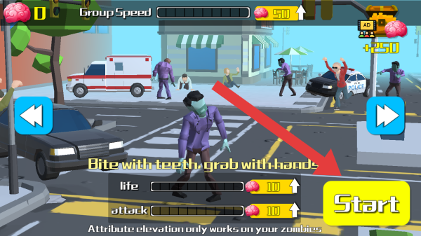 1、呈現(xiàn)僵尸入侵城市的場景,界面有“GroupSpeed”“l(fā)ife”“attack”等屬性顯示,還有【Start(開始)】按鈕,玩家可提升僵尸屬性后開始戰(zhàn)斗,屬于僵尸養(yǎng)成戰(zhàn)斗類玩法。