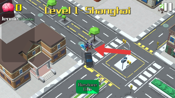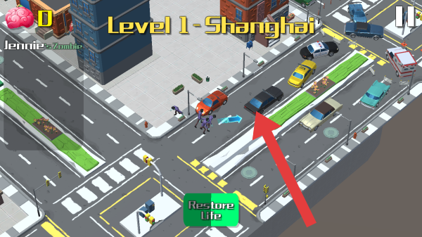 2、顯示了城市街道場景,有僵尸群體、車輛、建筑,還有“RestoreLife”功能按鈕,呈現(xiàn)了在上海地圖關(guān)卡進(jìn)行僵尸對戰(zhàn)、生存冒險(xiǎn)的玩法場景。