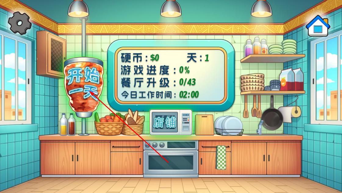 1、點(diǎn)擊“進(jìn)入店內(nèi)”,開(kāi)啟經(jīng)營(yíng),接待顧客,制作沙威瑪,賺金幣升級(jí)。